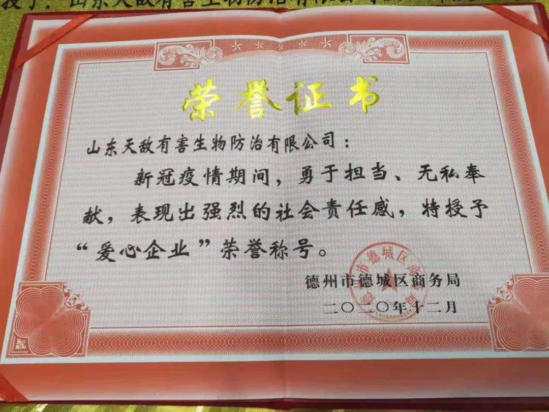 在全國上下共同防疫的關(guān)鍵時刻,山東天敵有害生物防治有限公司挺身而出,對二十余家公共場所進行無償消毒,在消毒用品緊缺的情況下,我司將庫存價值50萬的消毒用品(消毒片、消毒設(shè)備等)無一銷售,全部用于無償消毒并捐贈。